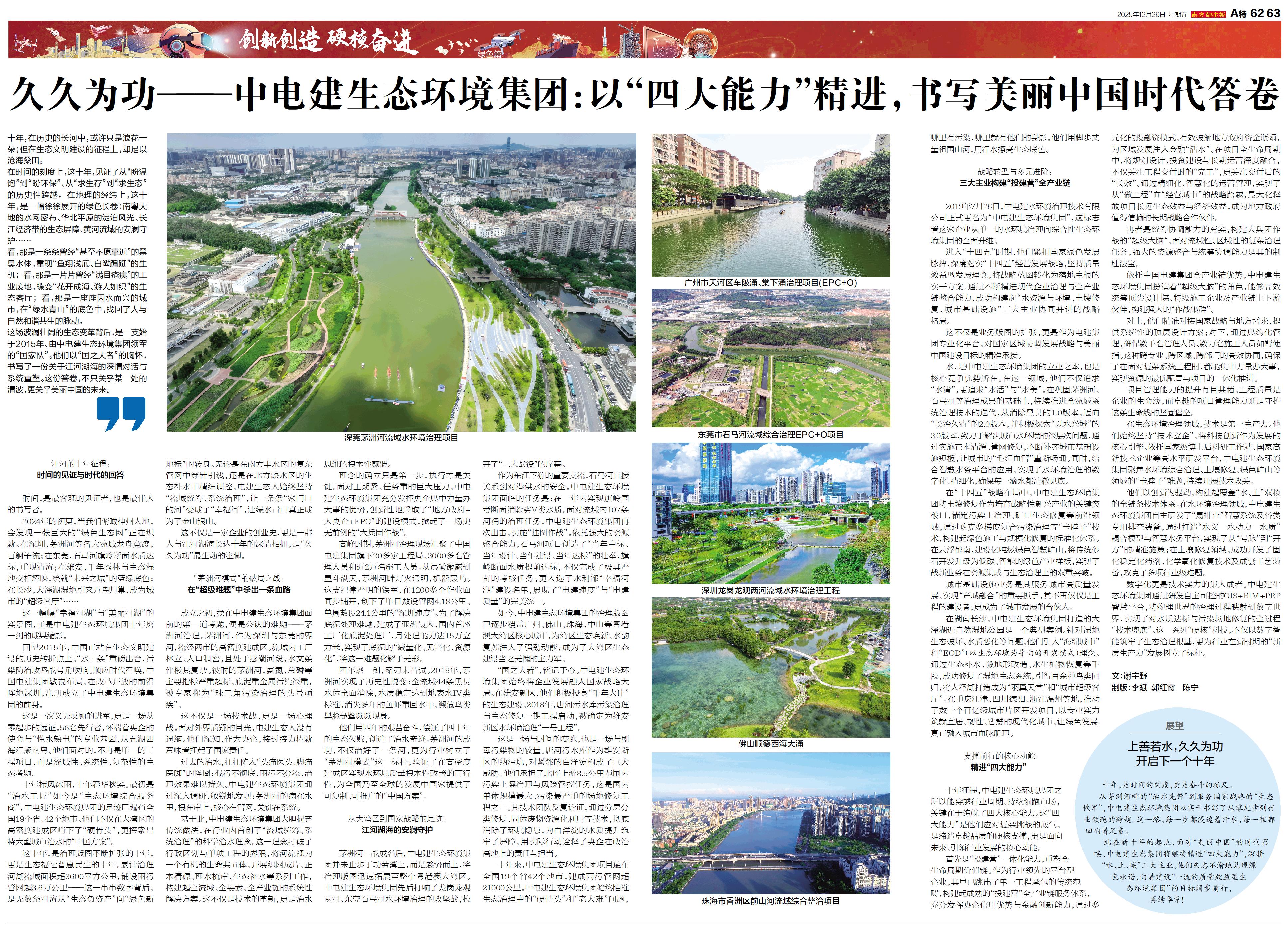 12月26日,《南方都市報》特刊以《久久為功——中電建生態環境集團:以“四大能力”精進,書寫美麗中國時代答卷》為題,整版深度報道了電建生態公司成立十年來扎根深圳,以科技創新為引領,積極服務國家戰略、助力生態文明建設的亮眼成就。 亞太經合組織(APEC)第三十三次領導人非正式會議將于2026年11月在深圳舉辦,這是繼2001年上海和2014年北京之后,深圳成為中國第三個舉辦APEC的城市。南方都市報社此次推出《APEC@SHENZHEN-—相約深圳 相約未來》特別策劃,旨在聚焦中國式現代化的深圳示范,拆解中國方案里的深圳智慧和經驗,向世界傳遞中國式現代化的深圳實踐密碼。 報道指出,始于2015年,由中電建生態環境集團領軍的“國家隊”,以“國之大者”的胸懷,依托中國電建全產業鏈優勢,從茅洲河畔的“治水先鋒”到服務國家戰略的“生態鐵軍”,展開了一場關于江河湖海的深情對話與系統重塑。一條條曾經避之不及的黑臭水體,重現“魚翔淺底、白鷺蹁躚”的生機;一片片曾經“滿目瘡痍”的工業廢地,蝶變為“花開成海、游人如織”的生態客廳;一座座因水而興的城市,在“綠水青山”的底色中,找回了人與自然和諧共生的脈動。這份答卷,不只關乎一河一湖的清波,更關乎美麗中國的未來。 2015年12月29日,中國電建順應時代召喚,敏銳布局,在改革開放的前沿陣地深圳,注冊成立了中電建生態環境集團的前身。成立十年來,電建生態公司從深圳茅洲河治理破局起步,在行業內首創了“流域統籌、系統治理”的科學治水理念,用四年的艱苦奮斗,償還了四十年的生態欠賬,為行業樹立了“茅洲河模式”的治水標桿。此后,電建生態公司精準對接國家戰略,立足粵港澳大灣區,將治理版圖逐步覆蓋至全國各地,如今業務已遍布全國19個省42個地市?!笆奈濉逼陂g,電建生態公司緊扣國家綠色發展脈搏,不斷精進現代企業治理與全產業鏈整合能力,成功構建起“水資源與環境、土壤修復、城市基礎設施”三大主業協同并進的戰略格局,培育形成了以“投建營”一體化能力、統籌協調能力、項目管理能力、核心技術實力為優勢的“四大能力”,發展成為國內生態環保行業領軍企業,在全國各地打造了一大批生態標桿工程,贏得了各級政府、行業專家、合作伙伴和人民群眾的高度認可。 展望未來,電建生態公司將繼續依托中國電建資源優勢,不斷精進“四大能力”,深耕“水、土、城”三大主業,真抓實干,久久為功,為行業發展和生態文明建設持續貢獻電建智慧和力量。 報道鏈接:https://epaper.oeeee.com/epaper/TK/html/2025-12/26/content_13424.htm#article |